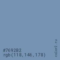 Цвет #7692B2 в цветовой модели RGB обозначается тремя октетами (118, 146, 178) в десятичном формате и #7692B2 в шестнадцатиричном (hex) формате, которые являются интенсивностью красного 118 (hex 76), интенсивность зелёного 146 (hex 92) и интенсивность синего 178 (hex B2).