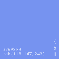Цвет #7693F0 в цветовой модели RGB обозначается тремя октетами (118, 147, 240) в десятичном формате и #7693F0 в шестнадцатиричном (hex) формате, которые являются интенсивностью красного 118 (hex 76), интенсивность зелёного 147 (hex 93) и интенсивность синего 240 (hex F0).