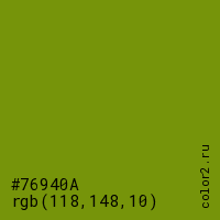 Цвет #76940A в цветовой модели RGB обозначается тремя октетами (118, 148, 10) в десятичном формате и #76940A в шестнадцатиричном (hex) формате, которые являются интенсивностью красного 118 (hex 76), интенсивность зелёного 148 (hex 94) и интенсивность синего 10 (hex 0A).