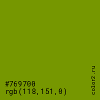 Цвет #769700 в цветовой модели RGB обозначается тремя октетами (118, 151, 0) в десятичном формате и #769700 в шестнадцатиричном (hex) формате, которые являются интенсивностью красного 118 (hex 76), интенсивность зелёного 151 (hex 97) и интенсивность синего 0 (hex 00).