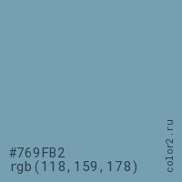 Цвет #769FB2 в цветовой модели RGB обозначается тремя октетами (118, 159, 178) в десятичном формате и #769FB2 в шестнадцатиричном (hex) формате, которые являются интенсивностью красного 118 (hex 76), интенсивность зелёного 159 (hex 9F) и интенсивность синего 178 (hex B2).