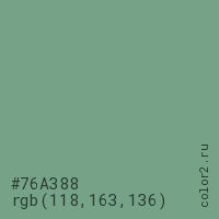 Цвет #76A388 в цветовой модели RGB обозначается тремя октетами (118, 163, 136) в десятичном формате и #76A388 в шестнадцатиричном (hex) формате, которые являются интенсивностью красного 118 (hex 76), интенсивность зелёного 163 (hex A3) и интенсивность синего 136 (hex 88).