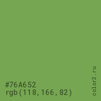 Цвет #76A652 в цветовой модели RGB обозначается тремя октетами (118, 166, 82) в десятичном формате и #76A652 в шестнадцатиричном (hex) формате, которые являются интенсивностью красного 118 (hex 76), интенсивность зелёного 166 (hex A6) и интенсивность синего 82 (hex 52).