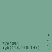 Цвет #76A894 в цветовой модели RGB обозначается тремя октетами (118, 168, 148) в десятичном формате и #76A894 в шестнадцатиричном (hex) формате, которые являются интенсивностью красного 118 (hex 76), интенсивность зелёного 168 (hex A8) и интенсивность синего 148 (hex 94).