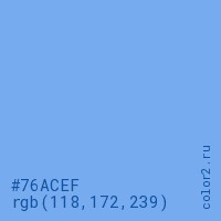 Цвет #76ACEF в цветовой модели RGB обозначается тремя октетами (118, 172, 239) в десятичном формате и #76ACEF в шестнадцатиричном (hex) формате, которые являются интенсивностью красного 118 (hex 76), интенсивность зелёного 172 (hex AC) и интенсивность синего 239 (hex EF).