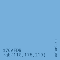 Цвет #76AFDB в цветовой модели RGB обозначается тремя октетами (118, 175, 219) в десятичном формате и #76AFDB в шестнадцатиричном (hex) формате, которые являются интенсивностью красного 118 (hex 76), интенсивность зелёного 175 (hex AF) и интенсивность синего 219 (hex DB).