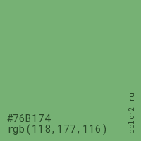 Цвет #76B174 в цветовой модели RGB обозначается тремя октетами (118, 177, 116) в десятичном формате и #76B174 в шестнадцатиричном (hex) формате, которые являются интенсивностью красного 118 (hex 76), интенсивность зелёного 177 (hex B1) и интенсивность синего 116 (hex 74).