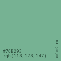 Цвет #76B293 в цветовой модели RGB обозначается тремя октетами (118, 178, 147) в десятичном формате и #76B293 в шестнадцатиричном (hex) формате, которые являются интенсивностью красного 118 (hex 76), интенсивность зелёного 178 (hex B2) и интенсивность синего 147 (hex 93).