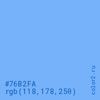 Цвет #76B2FA в цветовой модели RGB обозначается тремя октетами (118, 178, 250) в десятичном формате и #76B2FA в шестнадцатиричном (hex) формате, которые являются интенсивностью красного 118 (hex 76), интенсивность зелёного 178 (hex B2) и интенсивность синего 250 (hex FA).