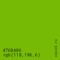 Цвет #76BA06 в цветовой модели RGB обозначается тремя октетами (118, 186, 6) в десятичном формате и #76BA06 в шестнадцатиричном (hex) формате, которые являются интенсивностью красного 118 (hex 76), интенсивность зелёного 186 (hex BA) и интенсивность синего 6 (hex 06).