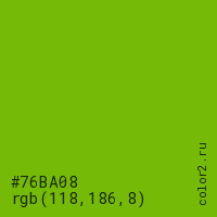 Цвет #76BA08 в цветовой модели RGB обозначается тремя октетами (118, 186, 8) в десятичном формате и #76BA08 в шестнадцатиричном (hex) формате, которые являются интенсивностью красного 118 (hex 76), интенсивность зелёного 186 (hex BA) и интенсивность синего 8 (hex 08).