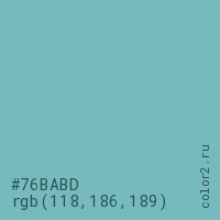 Цвет #76BABD в цветовой модели RGB обозначается тремя октетами (118, 186, 189) в десятичном формате и #76BABD в шестнадцатиричном (hex) формате, которые являются интенсивностью красного 118 (hex 76), интенсивность зелёного 186 (hex BA) и интенсивность синего 189 (hex BD).