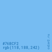 Цвет #76BCF2 в цветовой модели RGB обозначается тремя октетами (118, 188, 242) в десятичном формате и #76BCF2 в шестнадцатиричном (hex) формате, которые являются интенсивностью красного 118 (hex 76), интенсивность зелёного 188 (hex BC) и интенсивность синего 242 (hex F2).