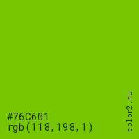 Цвет #76C601 в цветовой модели RGB обозначается тремя октетами (118, 198, 1) в десятичном формате и #76C601 в шестнадцатиричном (hex) формате, которые являются интенсивностью красного 118 (hex 76), интенсивность зелёного 198 (hex C6) и интенсивность синего 1 (hex 01).