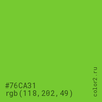 Цвет #76CA31 в цветовой модели RGB обозначается тремя октетами (118, 202, 49) в десятичном формате и #76CA31 в шестнадцатиричном (hex) формате, которые являются интенсивностью красного 118 (hex 76), интенсивность зелёного 202 (hex CA) и интенсивность синего 49 (hex 31).