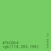 Цвет #76CD64 в цветовой модели RGB обозначается тремя октетами (118, 205, 100) в десятичном формате и #76CD64 в шестнадцатиричном (hex) формате, которые являются интенсивностью красного 118 (hex 76), интенсивность зелёного 205 (hex CD) и интенсивность синего 100 (hex 64).