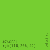 Цвет #76CE31 в цветовой модели RGB обозначается тремя октетами (118, 206, 49) в десятичном формате и #76CE31 в шестнадцатиричном (hex) формате, которые являются интенсивностью красного 118 (hex 76), интенсивность зелёного 206 (hex CE) и интенсивность синего 49 (hex 31).