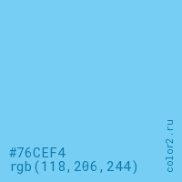 Цвет #76CEF4 в цветовой модели RGB обозначается тремя октетами (118, 206, 244) в десятичном формате и #76CEF4 в шестнадцатиричном (hex) формате, которые являются интенсивностью красного 118 (hex 76), интенсивность зелёного 206 (hex CE) и интенсивность синего 244 (hex F4).