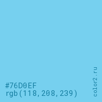 Цвет #76D0EF в цветовой модели RGB обозначается тремя октетами (118, 208, 239) в десятичном формате и #76D0EF в шестнадцатиричном (hex) формате, которые являются интенсивностью красного 118 (hex 76), интенсивность зелёного 208 (hex D0) и интенсивность синего 239 (hex EF).