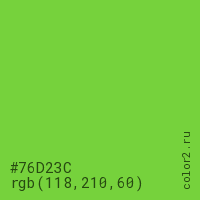 Цвет #76D23C в цветовой модели RGB обозначается тремя октетами (118, 210, 60) в десятичном формате и #76D23C в шестнадцатиричном (hex) формате, которые являются интенсивностью красного 118 (hex 76), интенсивность зелёного 210 (hex D2) и интенсивность синего 60 (hex 3C).