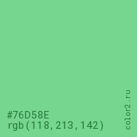 Цвет #76D58E в цветовой модели RGB обозначается тремя октетами (118, 213, 142) в десятичном формате и #76D58E в шестнадцатиричном (hex) формате, которые являются интенсивностью красного 118 (hex 76), интенсивность зелёного 213 (hex D5) и интенсивность синего 142 (hex 8E).