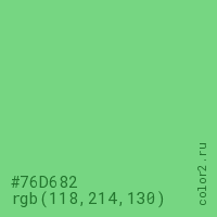 Цвет #76D682 в цветовой модели RGB обозначается тремя октетами (118, 214, 130) в десятичном формате и #76D682 в шестнадцатиричном (hex) формате, которые являются интенсивностью красного 118 (hex 76), интенсивность зелёного 214 (hex D6) и интенсивность синего 130 (hex 82).