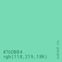 Цвет #76DBB4 в цветовой модели RGB обозначается тремя октетами (118, 219, 180) в десятичном формате и #76DBB4 в шестнадцатиричном (hex) формате, которые являются интенсивностью красного 118 (hex 76), интенсивность зелёного 219 (hex DB) и интенсивность синего 180 (hex B4).
