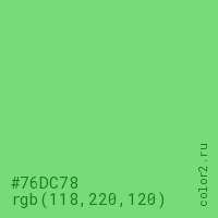 Цвет #76DC78 в цветовой модели RGB обозначается тремя октетами (118, 220, 120) в десятичном формате и #76DC78 в шестнадцатиричном (hex) формате, которые являются интенсивностью красного 118 (hex 76), интенсивность зелёного 220 (hex DC) и интенсивность синего 120 (hex 78).