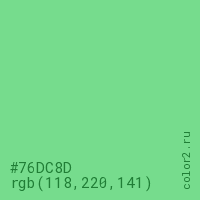 Цвет #76DC8D в цветовой модели RGB обозначается тремя октетами (118, 220, 141) в десятичном формате и #76DC8D в шестнадцатиричном (hex) формате, которые являются интенсивностью красного 118 (hex 76), интенсивность зелёного 220 (hex DC) и интенсивность синего 141 (hex 8D).
