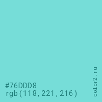 Цвет #76DDD8 в цветовой модели RGB обозначается тремя октетами (118, 221, 216) в десятичном формате и #76DDD8 в шестнадцатиричном (hex) формате, которые являются интенсивностью красного 118 (hex 76), интенсивность зелёного 221 (hex DD) и интенсивность синего 216 (hex D8).