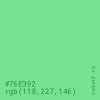 Цвет #76E392 в цветовой модели RGB обозначается тремя октетами (118, 227, 146) в десятичном формате и #76E392 в шестнадцатиричном (hex) формате, которые являются интенсивностью красного 118 (hex 76), интенсивность зелёного 227 (hex E3) и интенсивность синего 146 (hex 92).