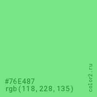 Цвет #76E487 в цветовой модели RGB обозначается тремя октетами (118, 228, 135) в десятичном формате и #76E487 в шестнадцатиричном (hex) формате, которые являются интенсивностью красного 118 (hex 76), интенсивность зелёного 228 (hex E4) и интенсивность синего 135 (hex 87).