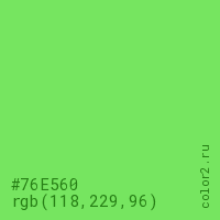 Цвет #76E560 в цветовой модели RGB обозначается тремя октетами (118, 229, 96) в десятичном формате и #76E560 в шестнадцатиричном (hex) формате, которые являются интенсивностью красного 118 (hex 76), интенсивность зелёного 229 (hex E5) и интенсивность синего 96 (hex 60).