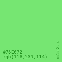 Цвет #76E672 в цветовой модели RGB обозначается тремя октетами (118, 230, 114) в десятичном формате и #76E672 в шестнадцатиричном (hex) формате, которые являются интенсивностью красного 118 (hex 76), интенсивность зелёного 230 (hex E6) и интенсивность синего 114 (hex 72).