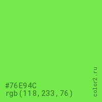 Цвет #76E94C в цветовой модели RGB обозначается тремя октетами (118, 233, 76) в десятичном формате и #76E94C в шестнадцатиричном (hex) формате, которые являются интенсивностью красного 118 (hex 76), интенсивность зелёного 233 (hex E9) и интенсивность синего 76 (hex 4C).