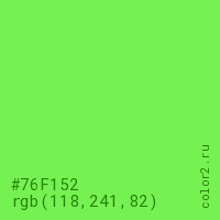 Цвет #76F152 в цветовой модели RGB обозначается тремя октетами (118, 241, 82) в десятичном формате и #76F152 в шестнадцатиричном (hex) формате, которые являются интенсивностью красного 118 (hex 76), интенсивность зелёного 241 (hex F1) и интенсивность синего 82 (hex 52).