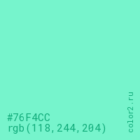 Цвет #76F4CC в цветовой модели RGB обозначается тремя октетами (118, 244, 204) в десятичном формате и #76F4CC в шестнадцатиричном (hex) формате, которые являются интенсивностью красного 118 (hex 76), интенсивность зелёного 244 (hex F4) и интенсивность синего 204 (hex CC).