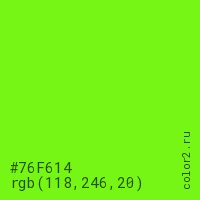 Цвет #76F614 в цветовой модели RGB обозначается тремя октетами (118, 246, 20) в десятичном формате и #76F614 в шестнадцатиричном (hex) формате, которые являются интенсивностью красного 118 (hex 76), интенсивность зелёного 246 (hex F6) и интенсивность синего 20 (hex 14).