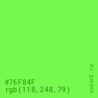 Цвет #76F84F в цветовой модели RGB обозначается тремя октетами (118, 248, 79) в десятичном формате и #76F84F в шестнадцатиричном (hex) формате, которые являются интенсивностью красного 118 (hex 76), интенсивность зелёного 248 (hex F8) и интенсивность синего 79 (hex 4F).