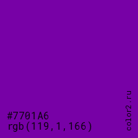 Цвет #7701A6 в цветовой модели RGB обозначается тремя октетами (119, 1, 166) в десятичном формате и #7701A6 в шестнадцатиричном (hex) формате, которые являются интенсивностью красного 119 (hex 77), интенсивность зелёного 1 (hex 01) и интенсивность синего 166 (hex A6).