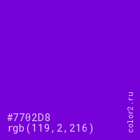 Цвет #7702D8 в цветовой модели RGB обозначается тремя октетами (119, 2, 216) в десятичном формате и #7702D8 в шестнадцатиричном (hex) формате, которые являются интенсивностью красного 119 (hex 77), интенсивность зелёного 2 (hex 02) и интенсивность синего 216 (hex D8).