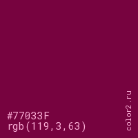 Цвет #77033F в цветовой модели RGB обозначается тремя октетами (119, 3, 63) в десятичном формате и #77033F в шестнадцатиричном (hex) формате, которые являются интенсивностью красного 119 (hex 77), интенсивность зелёного 3 (hex 03) и интенсивность синего 63 (hex 3F).
