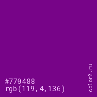 Цвет #770488 в цветовой модели RGB обозначается тремя октетами (119, 4, 136) в десятичном формате и #770488 в шестнадцатиричном (hex) формате, которые являются интенсивностью красного 119 (hex 77), интенсивность зелёного 4 (hex 04) и интенсивность синего 136 (hex 88).