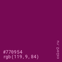 Цвет #770954 в цветовой модели RGB обозначается тремя октетами (119, 9, 84) в десятичном формате и #770954 в шестнадцатиричном (hex) формате, которые являются интенсивностью красного 119 (hex 77), интенсивность зелёного 9 (hex 09) и интенсивность синего 84 (hex 54).