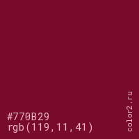 Цвет #770B29 в цветовой модели RGB обозначается тремя октетами (119, 11, 41) в десятичном формате и #770B29 в шестнадцатиричном (hex) формате, которые являются интенсивностью красного 119 (hex 77), интенсивность зелёного 11 (hex 0B) и интенсивность синего 41 (hex 29).