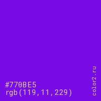 Цвет #770BE5 в цветовой модели RGB обозначается тремя октетами (119, 11, 229) в десятичном формате и #770BE5 в шестнадцатиричном (hex) формате, которые являются интенсивностью красного 119 (hex 77), интенсивность зелёного 11 (hex 0B) и интенсивность синего 229 (hex E5).