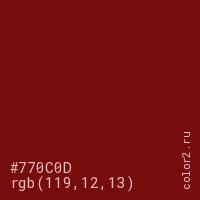Цвет #770C0D в цветовой модели RGB обозначается тремя октетами (119, 12, 13) в десятичном формате и #770C0D в шестнадцатиричном (hex) формате, которые являются интенсивностью красного 119 (hex 77), интенсивность зелёного 12 (hex 0C) и интенсивность синего 13 (hex 0D).