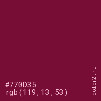 Цвет #770D35 в цветовой модели RGB обозначается тремя октетами (119, 13, 53) в десятичном формате и #770D35 в шестнадцатиричном (hex) формате, которые являются интенсивностью красного 119 (hex 77), интенсивность зелёного 13 (hex 0D) и интенсивность синего 53 (hex 35).
