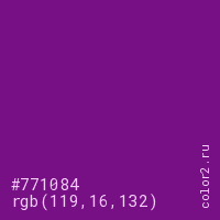 Цвет #771084 в цветовой модели RGB обозначается тремя октетами (119, 16, 132) в десятичном формате и #771084 в шестнадцатиричном (hex) формате, которые являются интенсивностью красного 119 (hex 77), интенсивность зелёного 16 (hex 10) и интенсивность синего 132 (hex 84).
