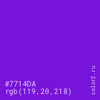 Цвет #7714DA в цветовой модели RGB обозначается тремя октетами (119, 20, 218) в десятичном формате и #7714DA в шестнадцатиричном (hex) формате, которые являются интенсивностью красного 119 (hex 77), интенсивность зелёного 20 (hex 14) и интенсивность синего 218 (hex DA).